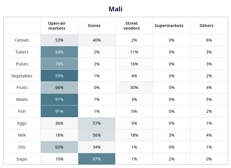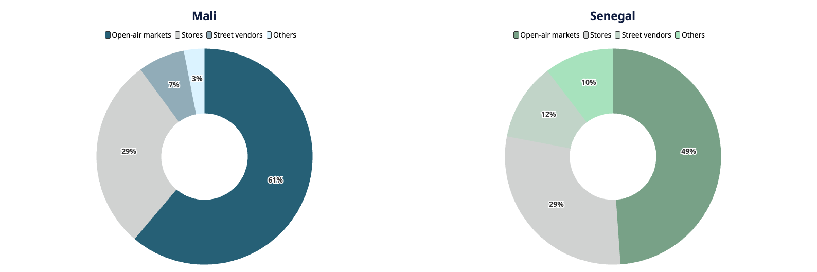 Where consumers shop significantly impacts the types of food available to them. In Mali, open-air markets still dominate for staples like tubers and vegetables, while dairy, eggs, and sweets are primarily bought from stores. Meat and fish continue to be purchased overwhelmingly at open-air markets, while street vendors often supply fruits. These variations underline how emerging retail diversity directly influences food access and dietary choices.