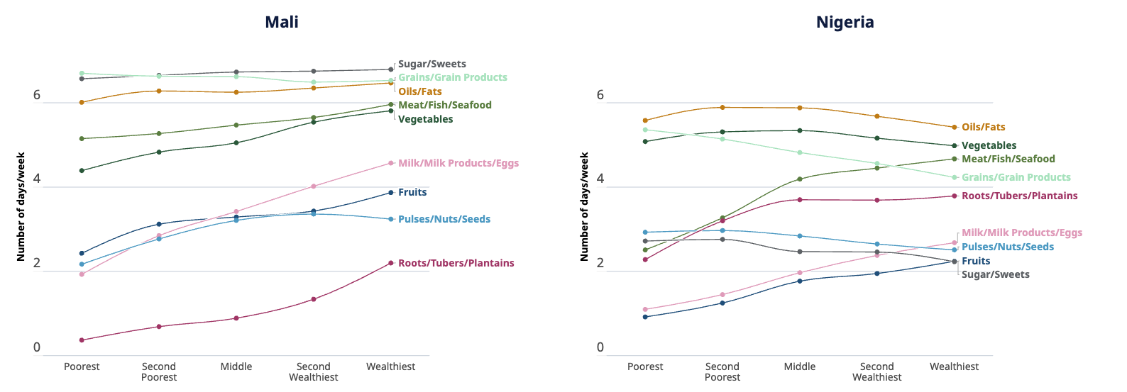 Food consumption frequency (#days/week) varies greatly by household income in Mali and Nigeria, 2018-19
