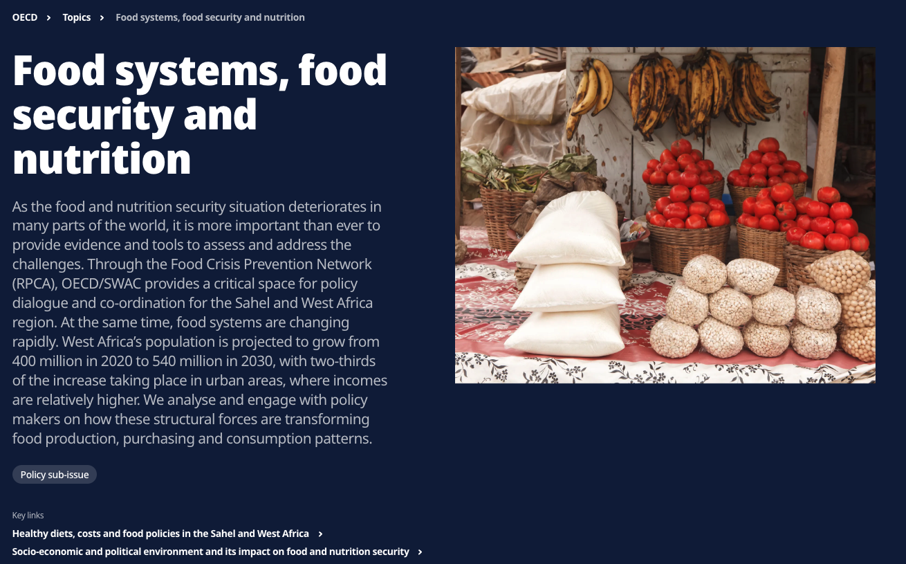Explore the OECD webpage on "Food systems, food security and nutrition" to learn more about our work on food systems transformations and food security and nutrition.