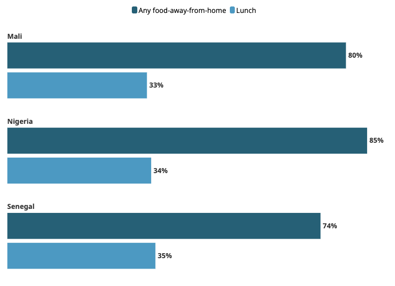 Eating away from home is now common, particularly in urban areas. About one-third of households in Mali, Nigeria and Senegal had members regularly eating lunch away from home in a given week.