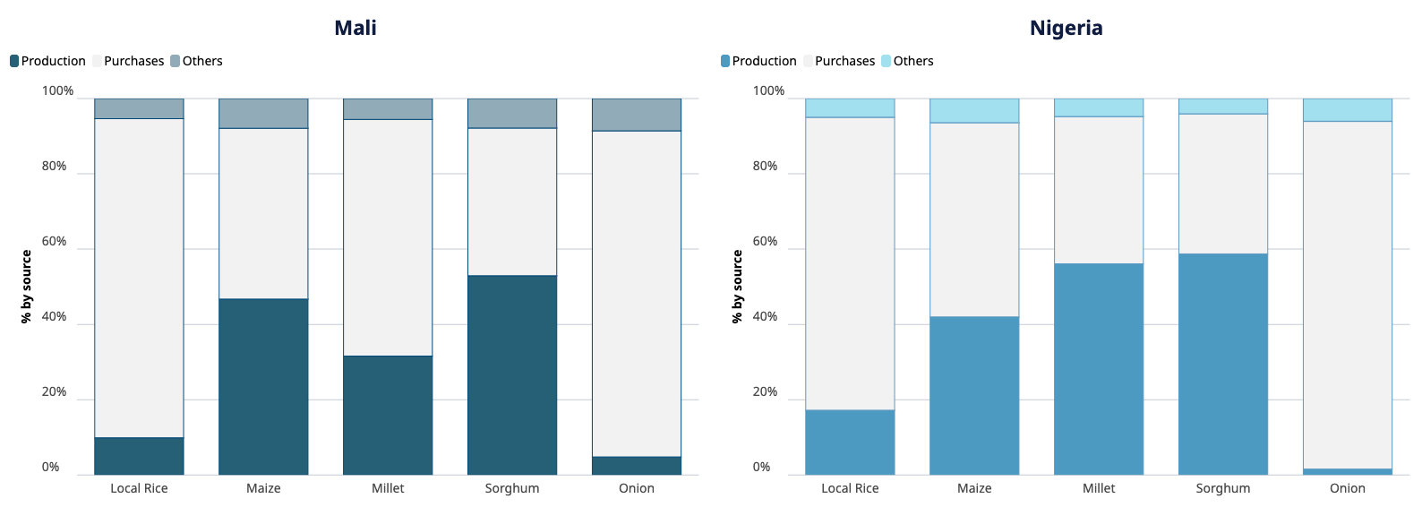 Even traditional staples like millet and sorghum, typically considered homegrown, are commonly bought—between two-fifths to three-quarters for millet, and one-third to one-half for sorghum across these countries.