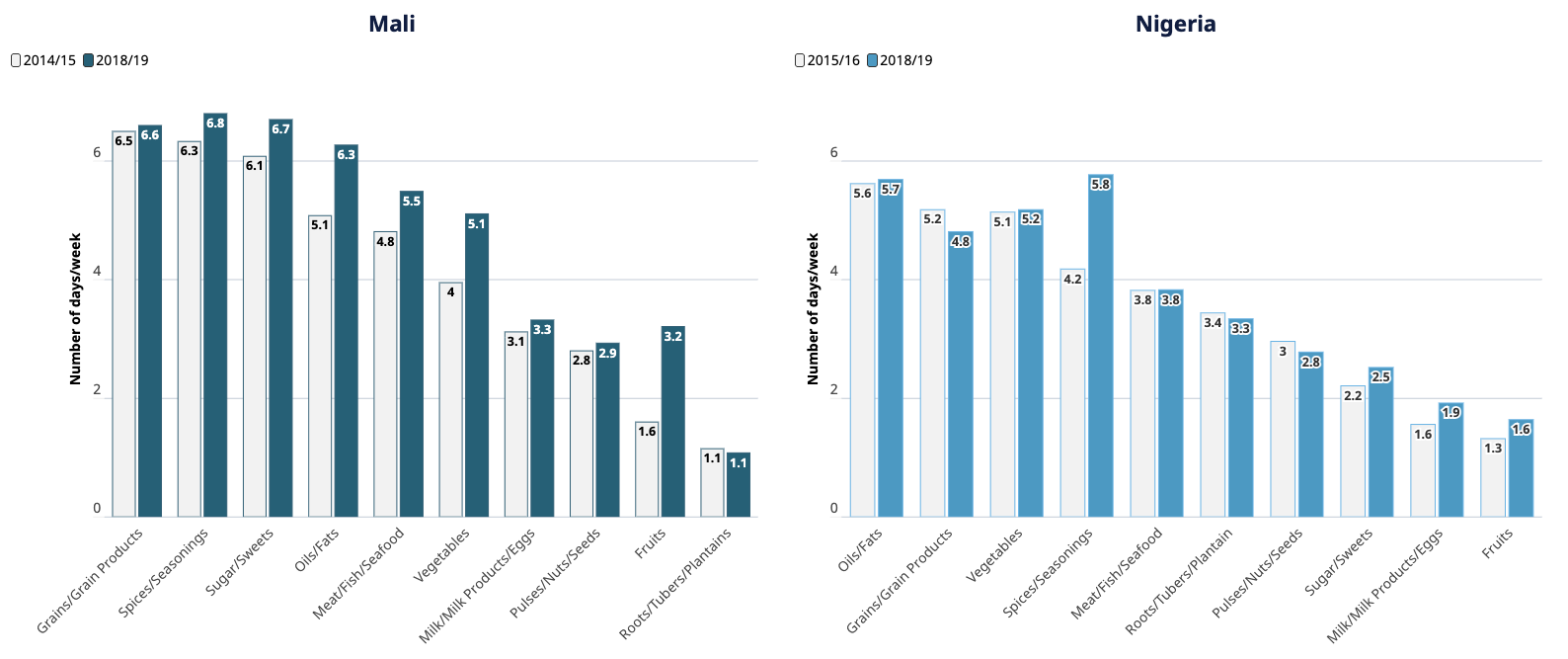 Rapid changes in weekly food consumption frequency in Mali and Nigeria (#days/week)